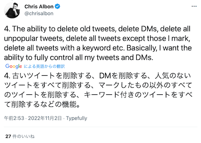 また、6日にはデータ・サイエンティストで著名なプログラマ、アルボン・クリス氏も、ツイートで「これから起きるツイッターの改変内容」を語りました。以下興味深いため、こちらに記載しましょう。