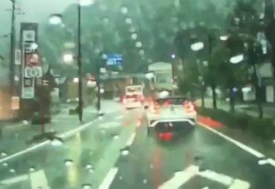 動画では、前方を走っていたワゴン車周辺が突如水蒸気に包まれ、視界が開けると同時に車体後方が直立寸前まで跳ね上がりその後落下。