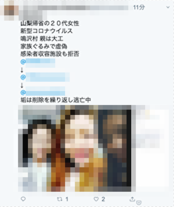 その氏名が噂となっている人物の名前を指していることから、女性が指しているのは山梨の感染女性の一件であると予想されますが、のちに無関係であることが判明しています。