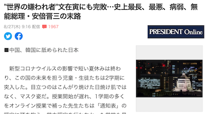 プレジデントオンラインに寄稿しているフリーライター・麹町文子氏は27日「”世界の嫌われ者”文在寅にも完敗…史上最長、最悪、病弱、無能総理・安倍晋三の末路」を投稿。