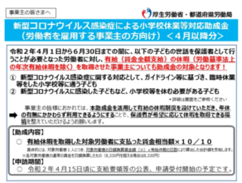 15日から雇用側に「小学校等の臨時休業に伴う保護者の休暇取得支援のための新たな助成金」
