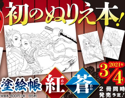 集英社は、漫画「鬼滅の刃」のぬりえ本「鬼滅の刃 塗絵帳 -紅-」及び「鬼滅の刃 塗絵帳 -蒼-」を、2021年3月4日に発売する。価格は各880円(税込)。