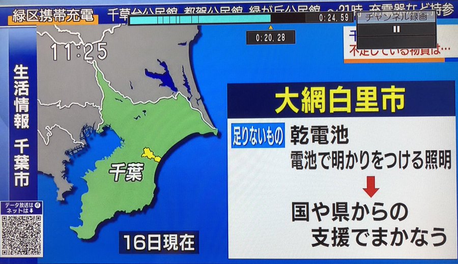 台風の影響で大網白里市も停電、断水で店が休業していて、物資が不足してきています。NHK以外はなかなか情報が報道されません。