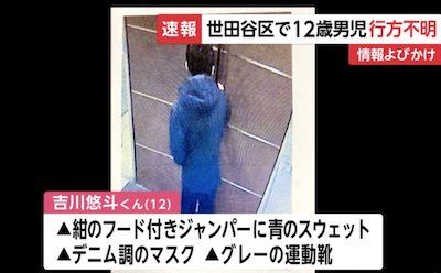 警視庁によると、世田谷区に住む小学6年・吉川悠斗君(12)が、23日の午前2時ごろに自宅を出たのを最後に、行方不明になっていることがわかった。