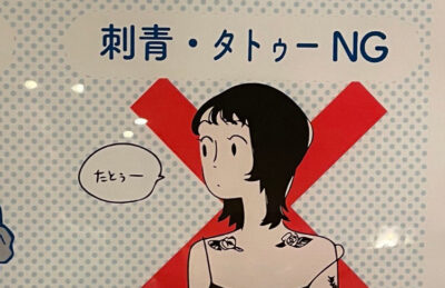 看板には「刺青・タトゥーのあるお客様は大浴場のご利用を控えてください。貸し切り風呂(有料)をご利用ください。」の言葉も。ここはどうやら銭湯付きの店舗の様。