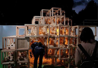 火災は16年11月6日午後5時15分ごろ、東京都新宿区霞ケ丘町の神宮外苑で発生。投光器の熱が伝わってアートとしてあしらわれていた木くずが燃え、中で遊んでいた東京都港区の幼稚園児が焼死し、助けようとした父親もやけどし重傷を負った。出典:朝日新聞
