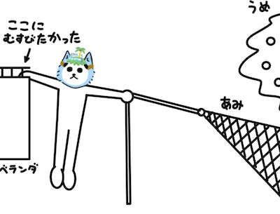 「梅の実を受け止める為の網を張り、高所作業で死にかけました」というちり紙@tole_peさんの図解付きツイート。