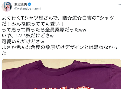 渡辺直美さん「よく行くTシャツ屋さんで、幽☆遊☆白書のTシャツだ!みんな映ってて可愛い!って思って買ったら全員桑原だったww いや、いい奴だけどさw可愛いんだけどさwまさか色んな角度の桑原だけデザインとは思わなかった」。